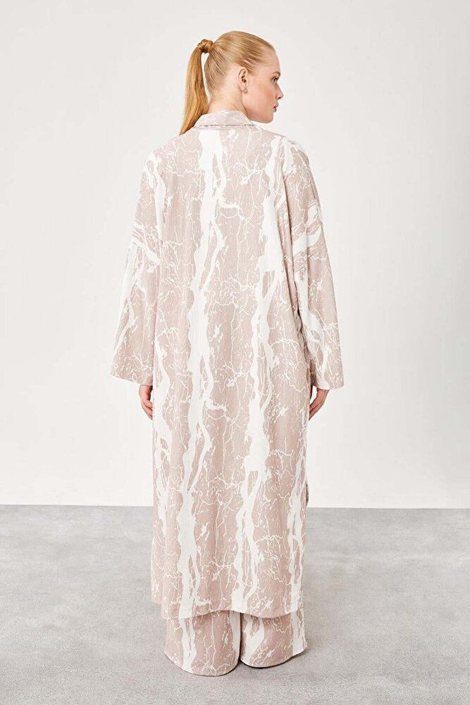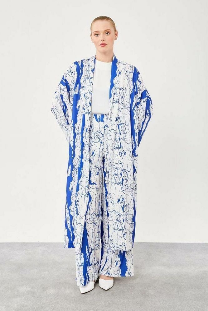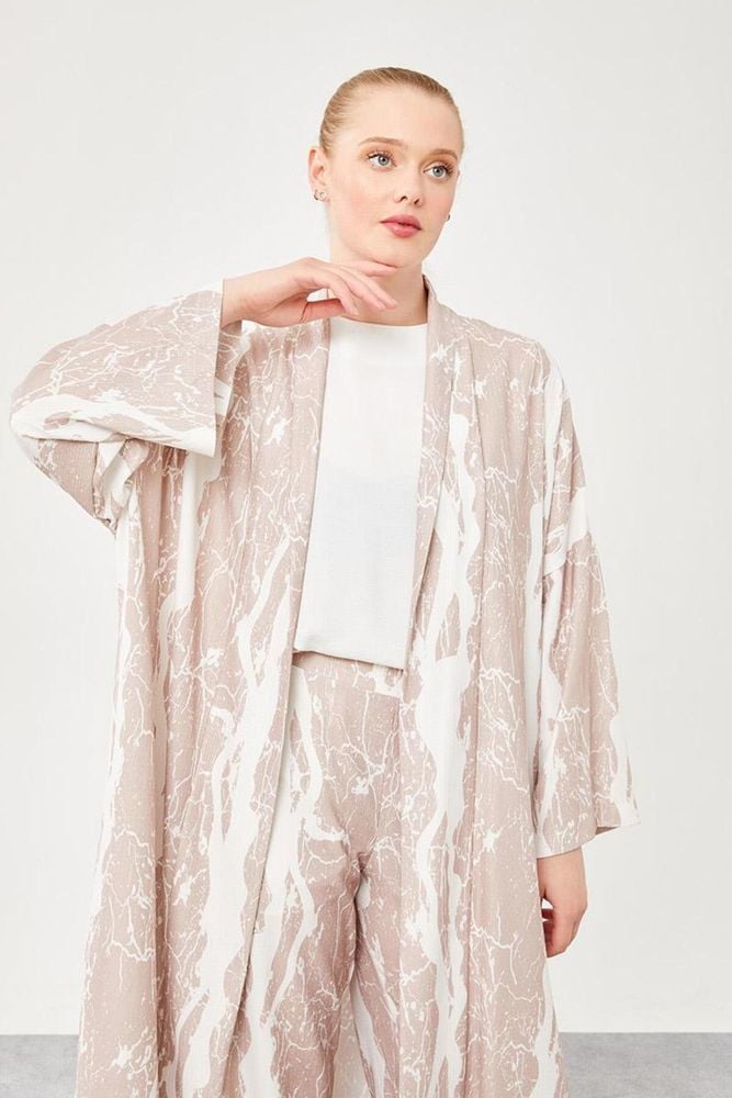 Lori Desenli Kimono Takım Pudra Desenli kimono: Soft kumaş, elastik bel bantlı, dökümlü orta bel pantolon. Model Boy:176 cm Göğüs:85 cm Bel:62 cm Basen:90 cm Ürün Bilgisi: Numune Bedeni:36 Renk: Pudra Açıklama: Lori Desenli Kimono Takım kaliteli işçiliği, ince detayları ve rahat kumaşıyla günlük kullanıma uygundur. Her tarza ve her ortama uyum sağlar.