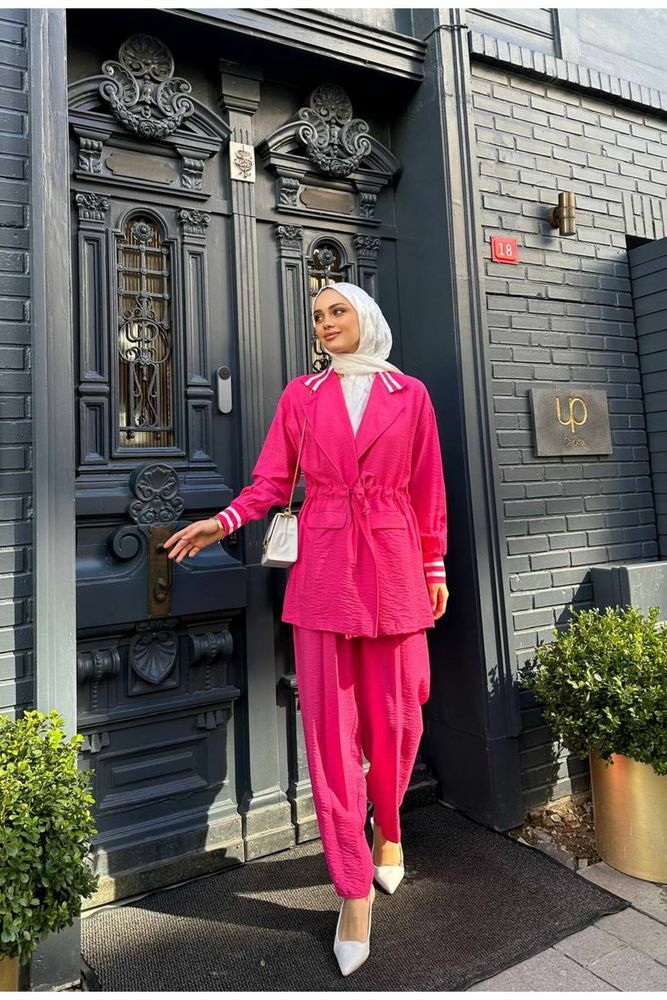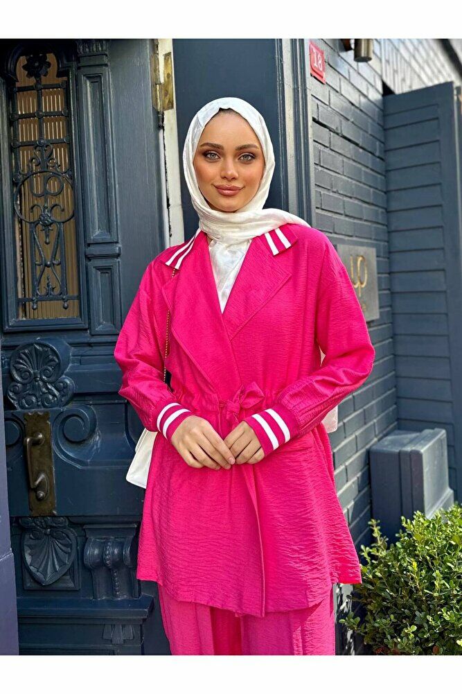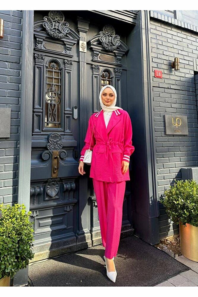 Çizgi Detaylı Pantolonlu Takım Fuşya