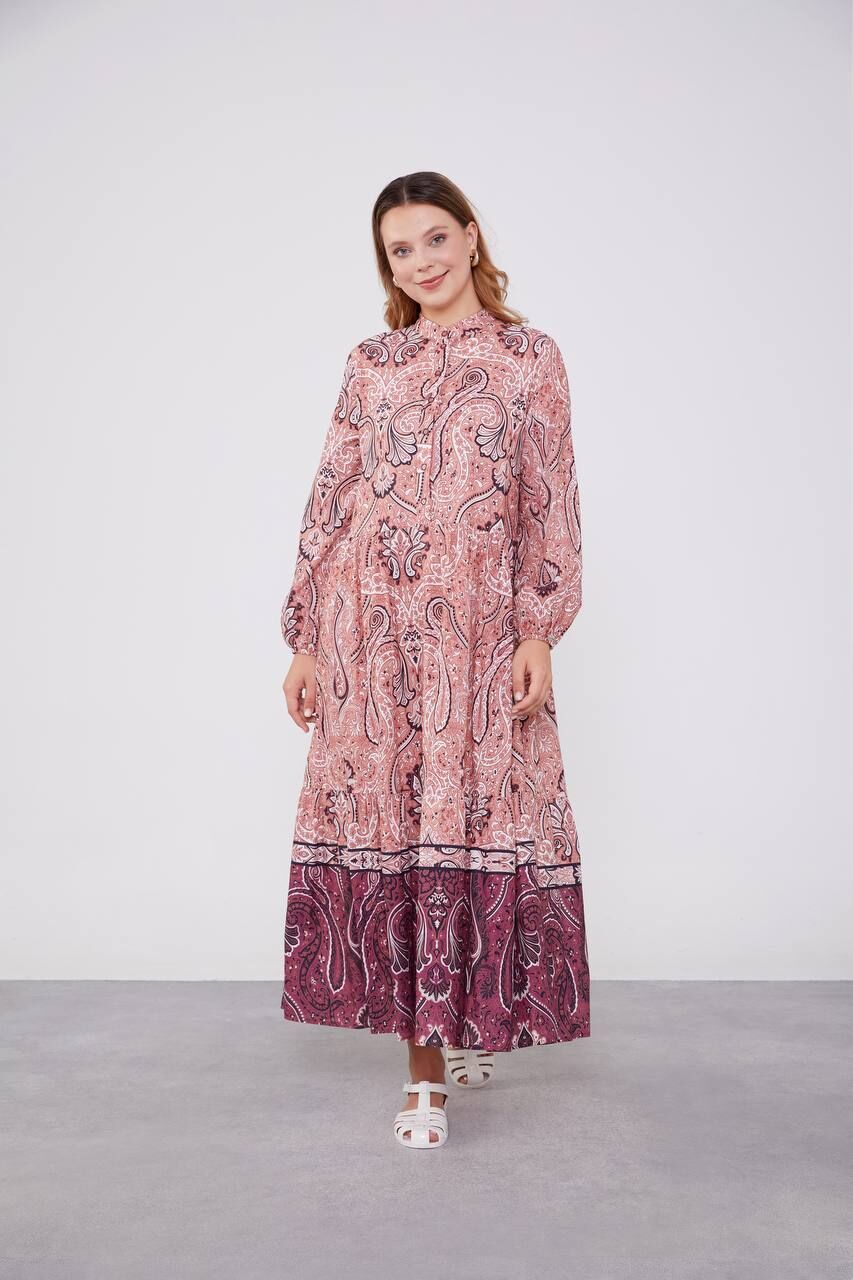 Pudra Düğme Detaylı Desenli Elbise